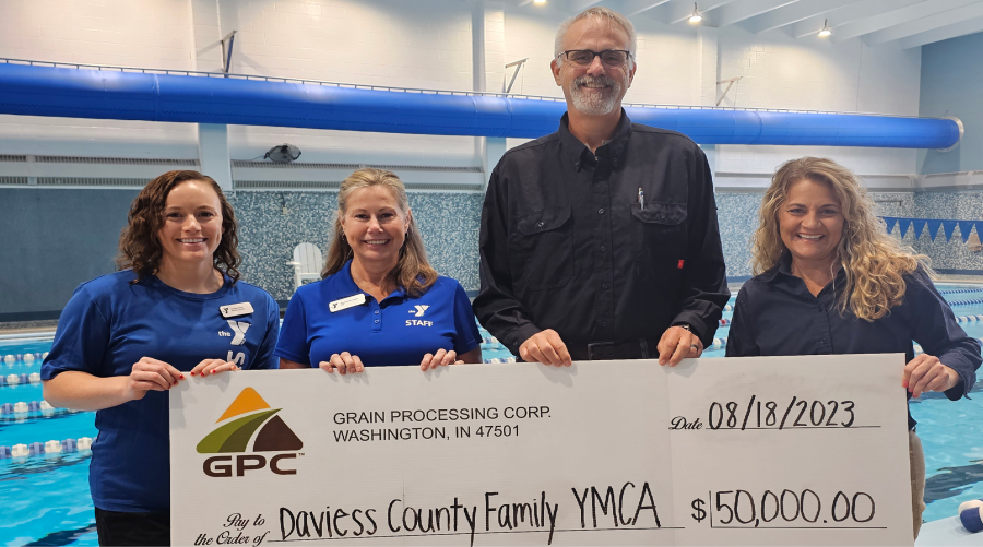 Washington, IN (Aug 21, 2023) — Children and adults in Daviess County will benefit from a $50,000 contribution from the KENT Charitable Foundation. Grain Processing Corporation (GPC) is a subsidiary of the family-owned KENT Corporation and has a strong affiliation with the Daviess County YMCA. The Daviess County YMCA’s Improve, Invest, Impact pool remediation project will serve over 1,800 community members a month in Washington, Indiana.