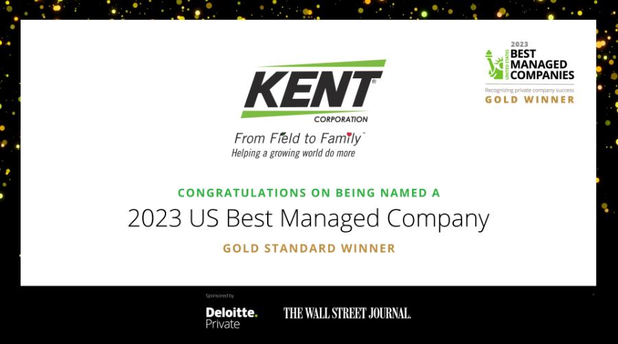 The award was first announced at KENT’s internal 2023 Service Award banquet, at which 204 employees were honored for 5, 10, 15, and up to 45 years for their contributions to the nearly 100-year-old family business. KENT is the only Iowa-based company on the awardee list and is among the first cohort of gold standard honorees who have achieved U.S. Best Managed Company designation for four consecutive years.