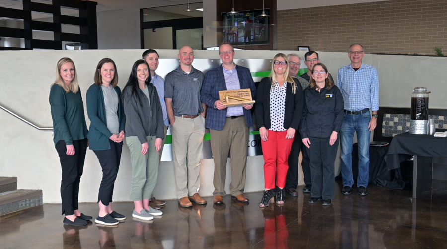 MUSCATINE, Iowa (March 27, 2023) – Muscatine County Area Habitat for Humanity presented KENT Corporation subsidiary, KENT Nutrition Group with the inaugural “Golden Hammer” award on Monday, March 20. In the spirit of friendly competition, the Golden Hammer recognizes a volunteer team for going above and beyond during Habitat’s home construction process.